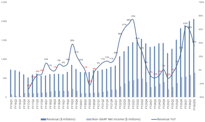 营收20.06亿美元,同比增长58%,环比增长6%;预计Q3营收20.6亿美元,同比增长36%;
