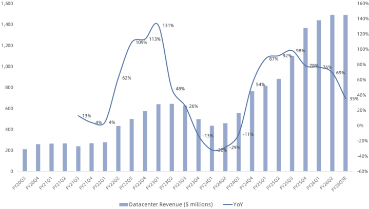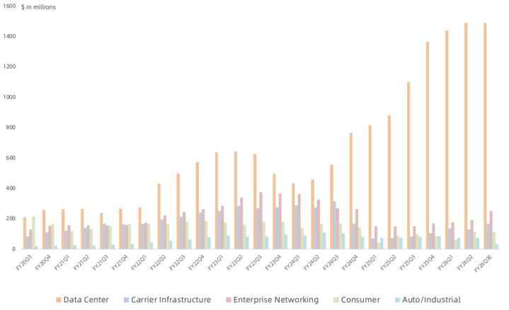 预计Q3数据中心营收持平(15亿美元左右,约为Intel数据中心Q3预测营收的38%、AMD数据中心营收的36%、博通AI营收的24%),光电业务环比两位数增长抵消XPU业务下滑;XPU业务有望在下半年实现环比上半年增长,预计这种增长将是非线性的,Q4的表现将远强于Q3;