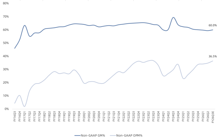 GAAP毛利率50.4%,同比增长4.2个百分点;NonGAAP毛利率59.4%,同比下滑2.5个百分点,环比下滑0.4个百分点,连续7个季度环比下滑;预计Q3NonGAAP毛利率60%,同比下滑0.5个百分点;